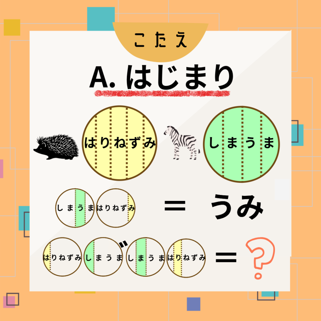 「はりねずみ」と「しまうま」の、対応する文字を読んでいくと、こたえは “はじまり” でした!