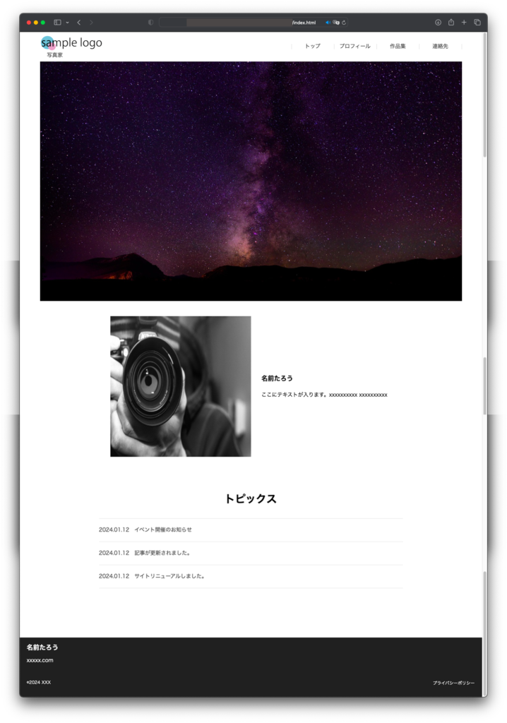 前は企業サイトだったので、今回は個人サイトです。写真家さんの設定です。↓
